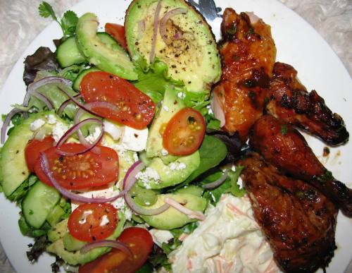 Cooking should take about 30 mins or so for a small bird but will take longer depending on the weight. Check on it after 15 minutes and rotate the bird, then once the skin is all crispy and brown, apply the basting liberally all over and close the lid for a further 5 minutes to allow it to go all sticky. Allow the bird to rest somewhere warm for a few minutes before carving (I just take the lid off and leave the bird on the grid), before carving into pieces. Serve with a green salad and some potato salad or garlic bread (I had neither, so had to settle for coleslaw).