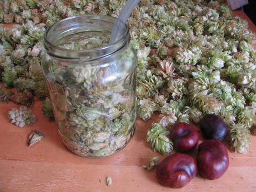 I had so many hop cones this year that it was actually quite a job to harvest them all. I ended up doing the whole lot over the course of two weeks, harvesting the plants one by one and drying on my kitchen table on newspaper for a few days with the assistance of a fan to help speed things along and reduce the chance of mould.