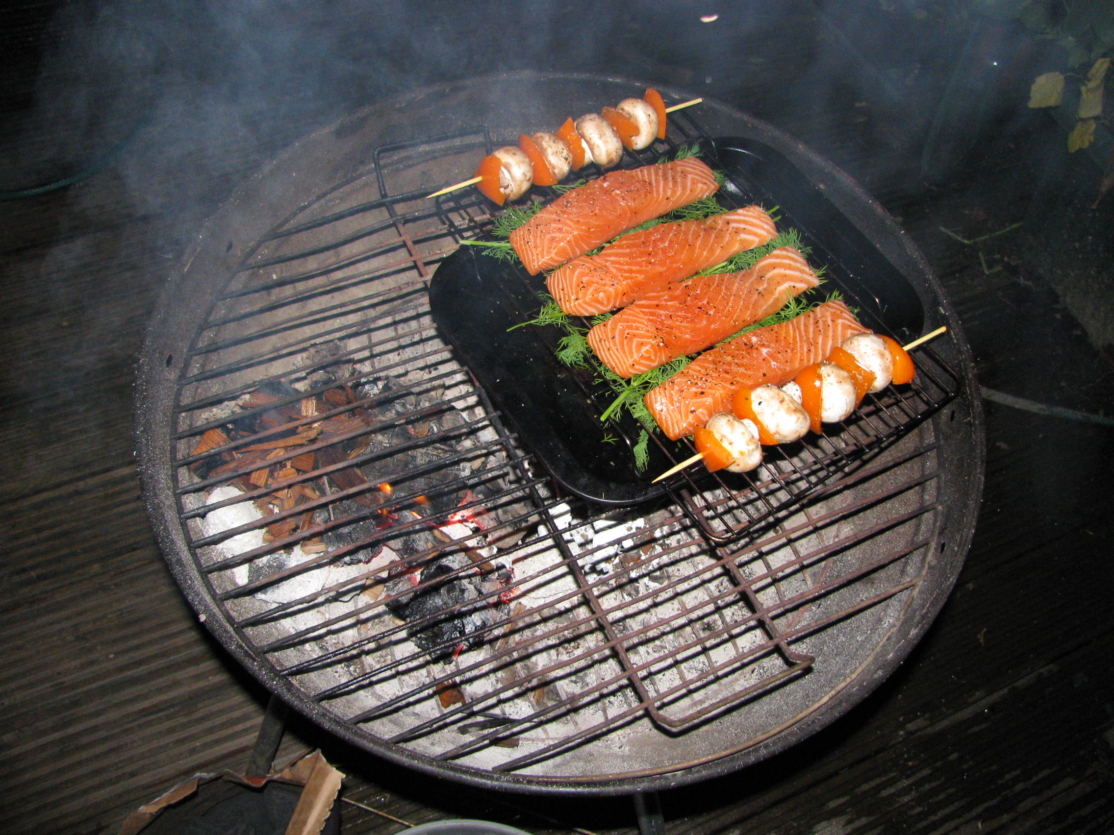 I got a fire going, starting with wood and then moving onto coal briquettes. To provide some smokey flavour, I managed to get hold of some oak wood chips. These chips are made from old whiskey barrels and rather unsurprisingly, they have a strong whiskey smell which works brilliantly with salmon. Before using them, they must be soaked in water so that they smoke, rather than burn, when put on the coals.
